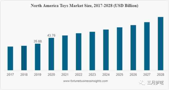 我们拿美国来举例,在2019-2021年的调查中发现,全美80%%的家庭都有节日给孩子买玩具的习惯。2020年全球的玩具市场的规模为1294.5亿美元,由于新冠疫情的影响,玩具的需求有所增加,2020年当年就实现了22.30%的增长,预计到2028年将增长到2306.4亿美元。