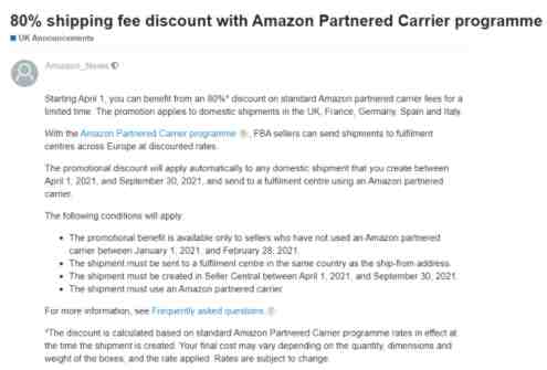 卖家可以享受80%的运费折扣3月5日,亚马逊发布有关“合作承运人计划将提供 80% 的运费折扣”公告,原文如下