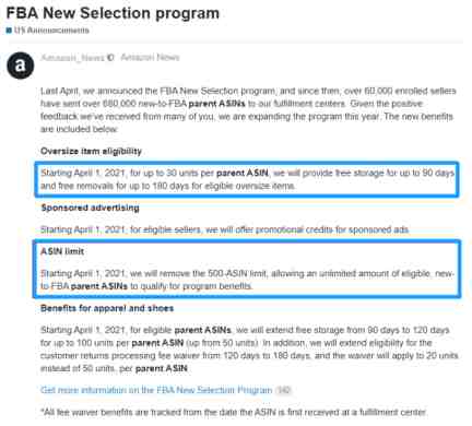 ASIN限制:从2021年4月1日开始,我们将取消500-ASIN限制,允许无限数量的合格,新加入FBA的父ASIN 获得计划权益。