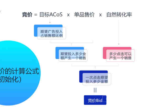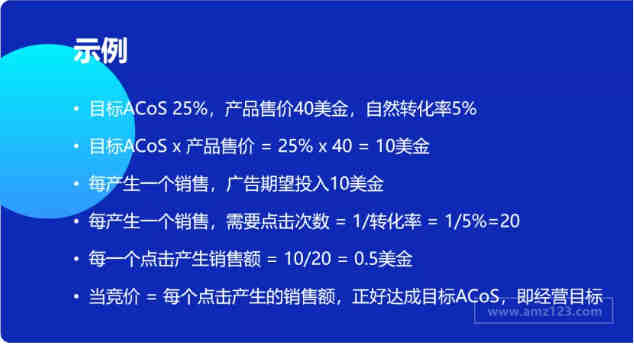 首先假设目标ACoS为25%,产品售价为40美金,自然转化率为5%。按照目标竞价计算公式,得到每产生一个销售,广告期望投入10美金,每一个产品的销售需要点击20次,每个点击产生销售额为0.5美金,当竞价等于每个点击产生的销售额,正好达成目标ACoS,即经营目标。