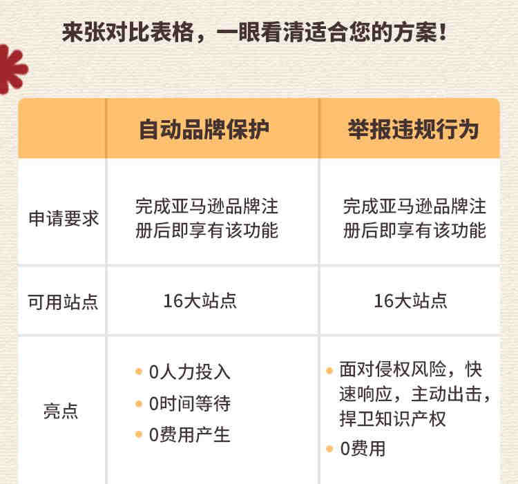 (2)如果成功通过亚马逊品牌注册,可享受亚马逊为全方位保护品牌、助理销量而推出的多种便利的工具。