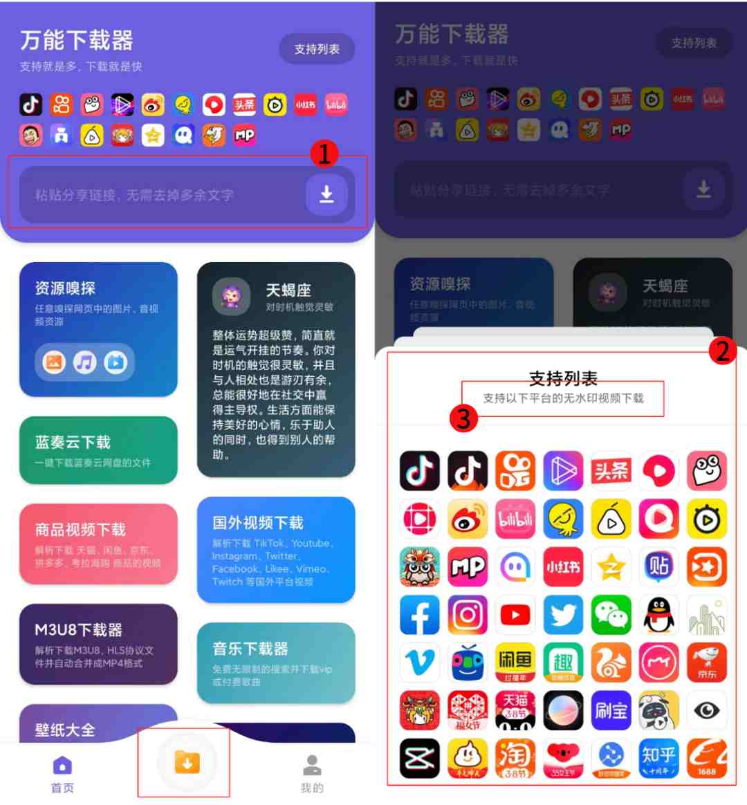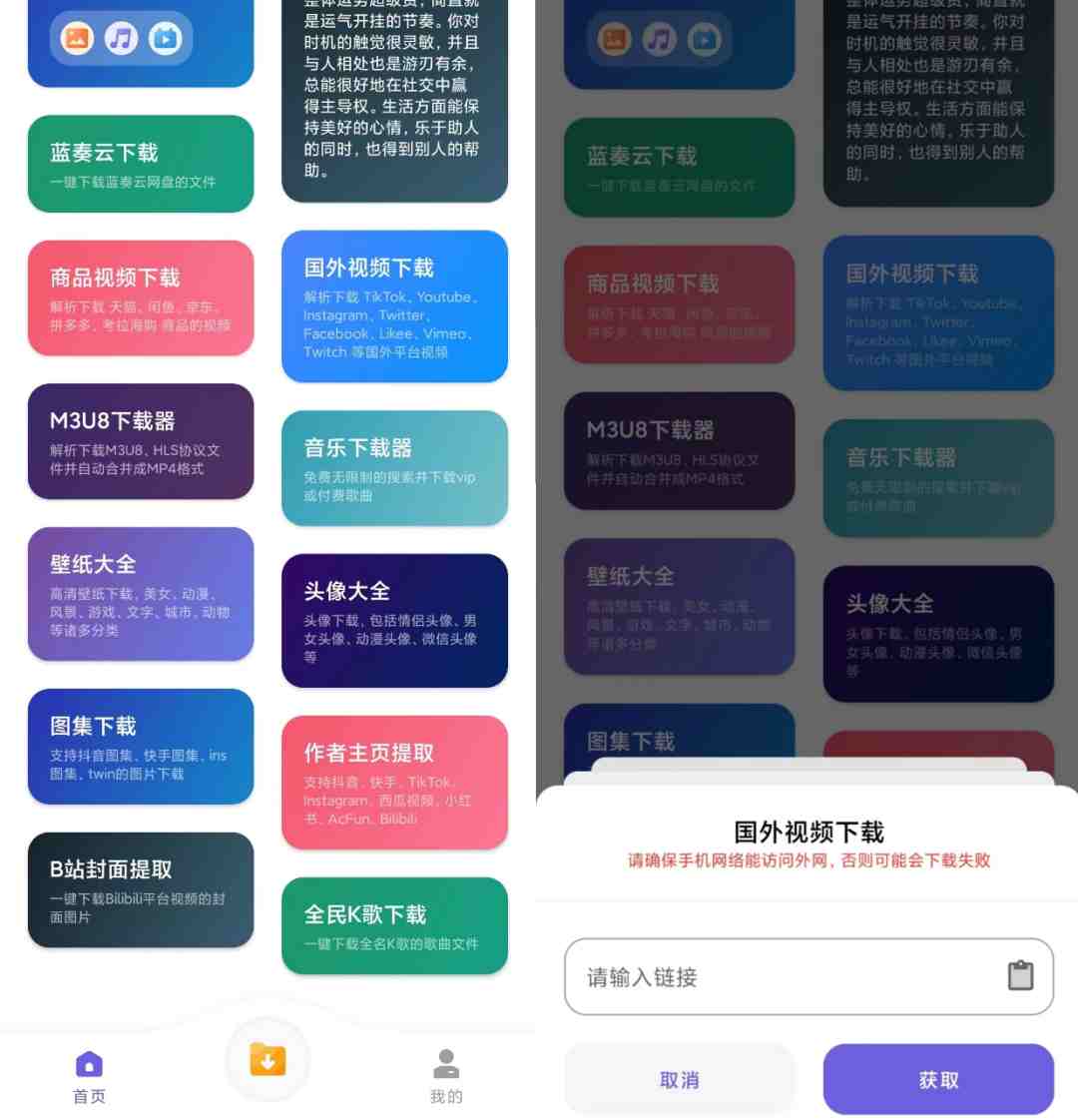 附带抖音高清图集下载、全民K歌下载、电商平台商品视频下载(亚马逊、淘宝、京东、拼多多)等功能;