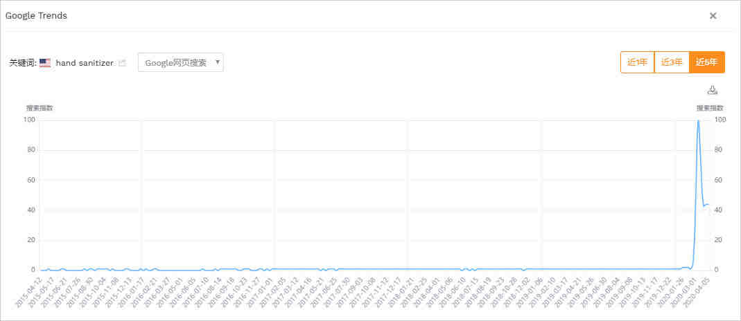 同时,使用谷歌趋势可以看出,消毒洗手液等产品搜索,已达到近5年来最高峰,需求远大于供给。