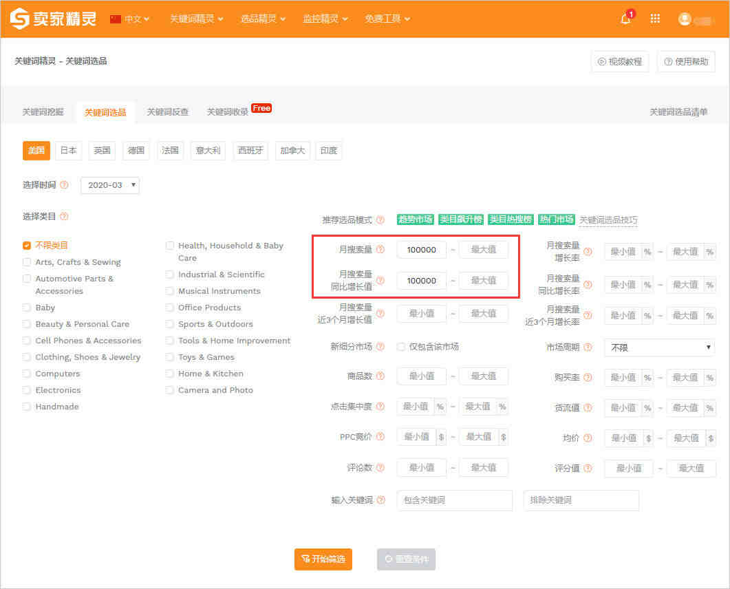 受疫情影响,全球多地开始居家办公。摄像头、键盘、鼠标等办公用品,阻力带、哑铃、瑜伽垫等家用健身器材,索尼PS4、任天堂Switch等线上娱乐用品的搜索量也在一路攀升。根据卖家精灵关键词选品工具展示的数据,3月份亚马逊平台的搜索量飙升关键词情况如图所示: