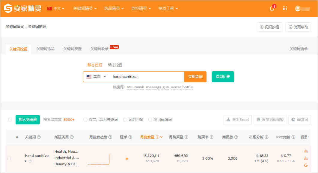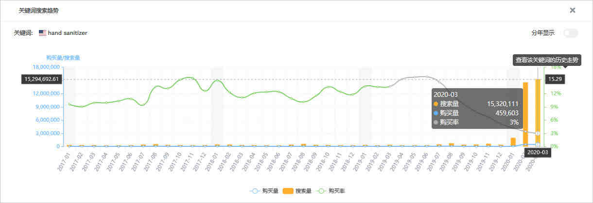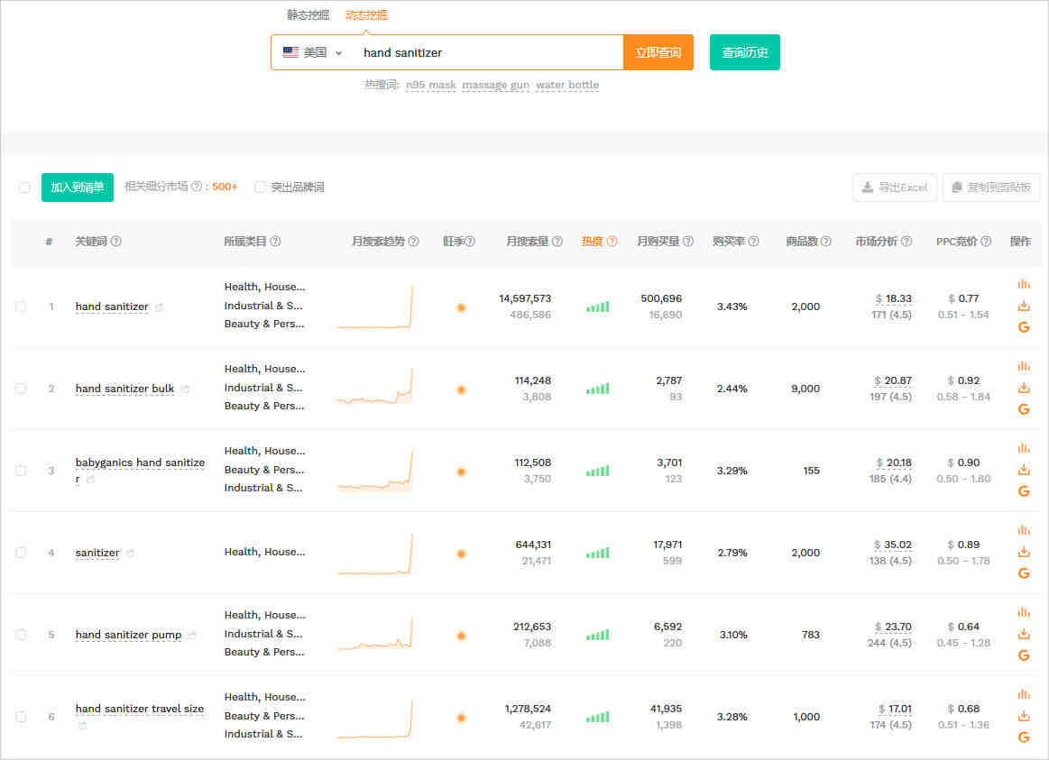 根据卖家精灵的关键词挖掘工具展示的数据,美国站hand sanitizer 一词在2月份搜索量为1460万,相较于1月份激增631%。3月份搜索量继续攀升,为1532万。