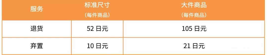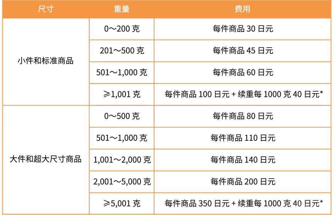 注:对于超出首重1,000克(小件和标准商品)或5,000克 (大件和超大尺寸商品)的重量,按克收取费用。例如,如果一件小件商品重量为1,500克,则费用为120日元(即100日元+40日元/1,000克 * 500克)