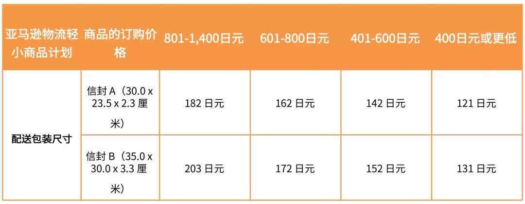 3)亚马逊物流轻小商品计划的商品价格变更为1000日元以下,商品的配送包装尺寸统一为一种,且按一个商品收取198日元(含税)进行收费。