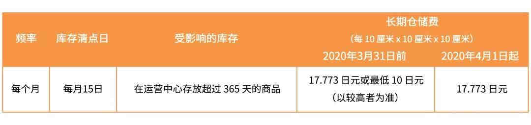 2)针对存放时间超过365天的商品,亚马逊日本站将取消每月按件收取的10日元最低长期仓储费,继续使用1,000立方厘(250pxx250pxx250px)的长期仓储费。此变更将在库存清点日(2020年4月)开始实施。