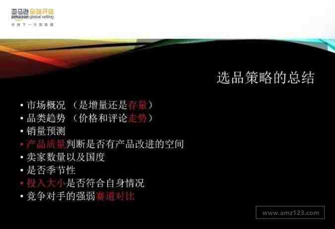 他们的选品思路,是大卖的玩法,不过很多方面还是值得学习的,中小卖家也可以直接用到的,比如市场分析的思路,做产品差异化的方法,然后根据自身的实力,选择对应的市场,日出几百单的产品让大卖玩去,中小卖家还是可以选择几十个以下的类目去玩。认清自己的实力,有多大能耐做多大的事情。