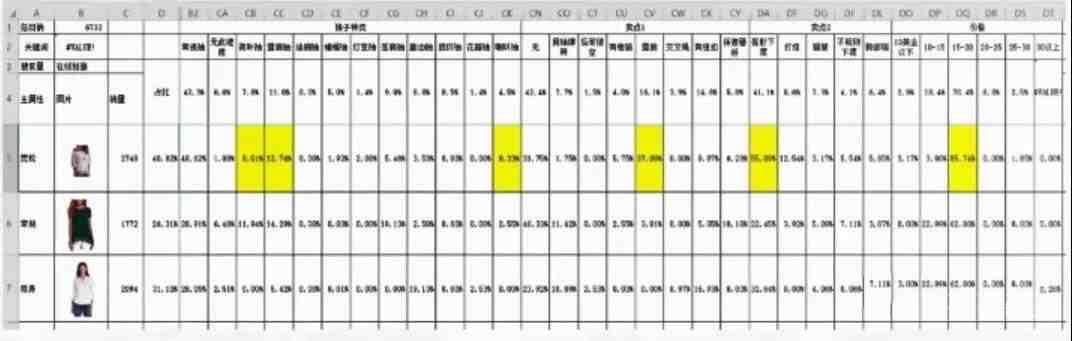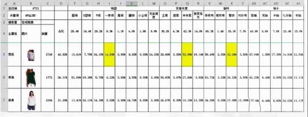 这是他们做的表格,他们会把衣服的领型、长度、面料、袖子里面的元素再进行拆解,比如领型分为:圆领,v领,y领,一字领等等。看看top100种,这些元素的占比,销量,价格等。通过这些占比分析,找出热卖的元素,价格带。