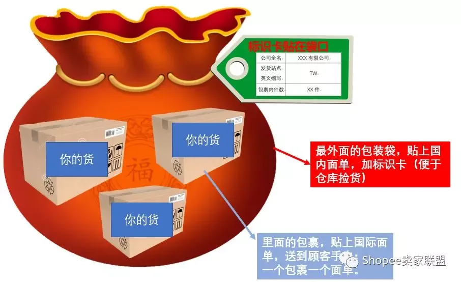 第一层包装,即最里面一层包装,是顾客最终收到的包裹,上面贴国际面单。 第二层包装,即发往仓库的包装,上面贴国内面单,袋口贴【标识卡】,寄往对应仓库。