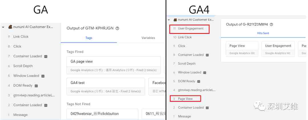 从图中可以很明显的发现,GA4 将 Page View 及 User Engagement 独立出来以事件的形式记录,这也就说明了在数据上的处理,都是从同样的“dataLayer”(Google Analytics 收集资讯的核心代码)中撷取,但呈现的样式却不同,我们在解读两种报表时,也要以两种不同的角度去思考,才能够发现数据背后真正的意义。