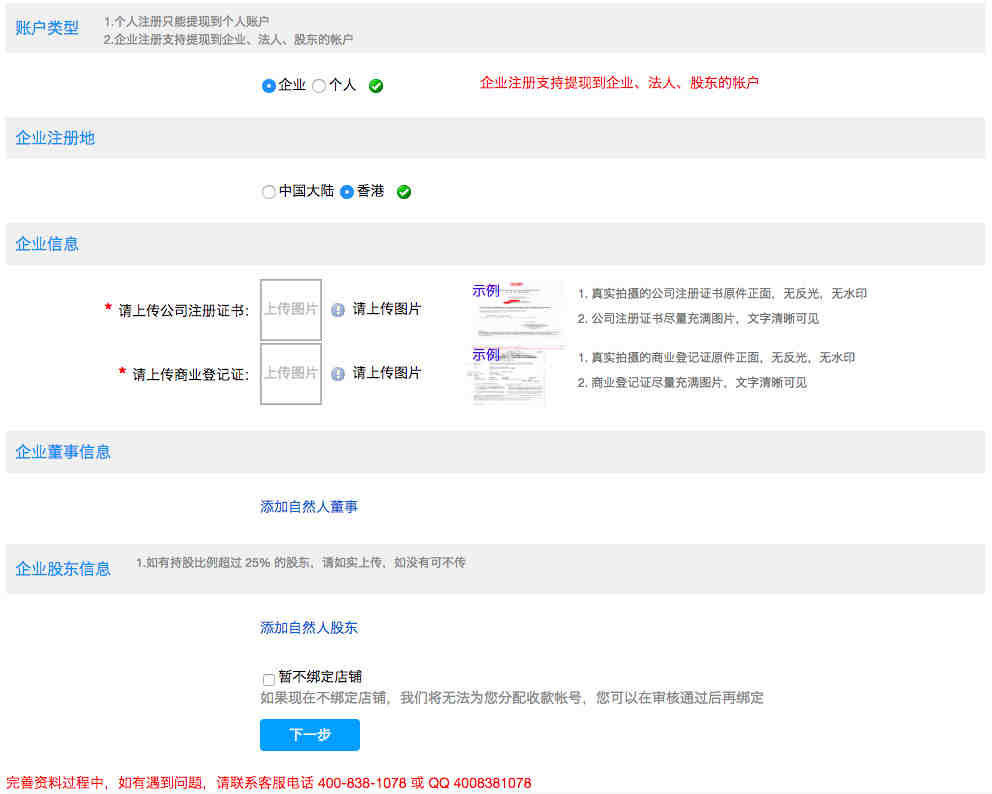 香港公司用户请选择 “香港”, 请上传香港公司注册资料, 包括有效的《公司注册证书》、《商业登记证》的原色扫描件、自然人股东以及董事的身份证信息(外籍自然人董事以及股东需要提交地址证明), 信息填写完整后点击 “下一步”