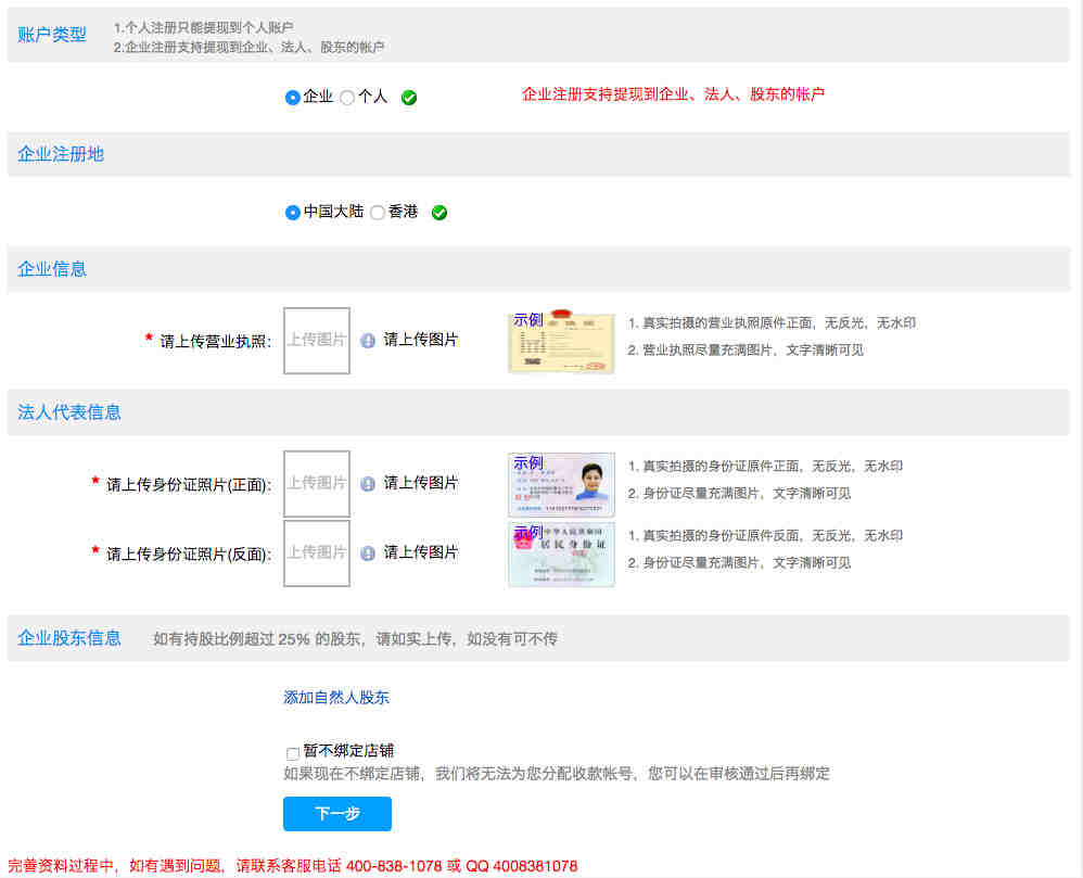 大陆企业用户请选择 “中国大陆” , 请上传大陆公司注册资料, 包括公司营业执照、法人身份证、持股超过25%的股东个人身份证, 信息填写完整后点击 “下一步”