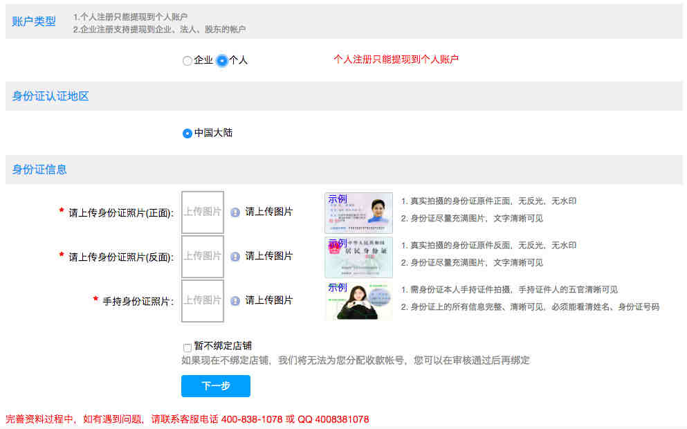 个人用户请上传身份证正反面照片及手持身份证的照片