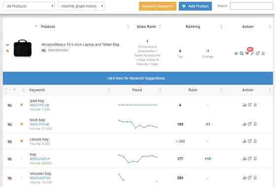 ③Rankings关键词排名查询 追踪亚马逊卖家Listing下关键词的排名及变化情况,卖家可根据排名数据变化来指导关键词设置和评估营销推广(PPC或其他促销)活动的效果。