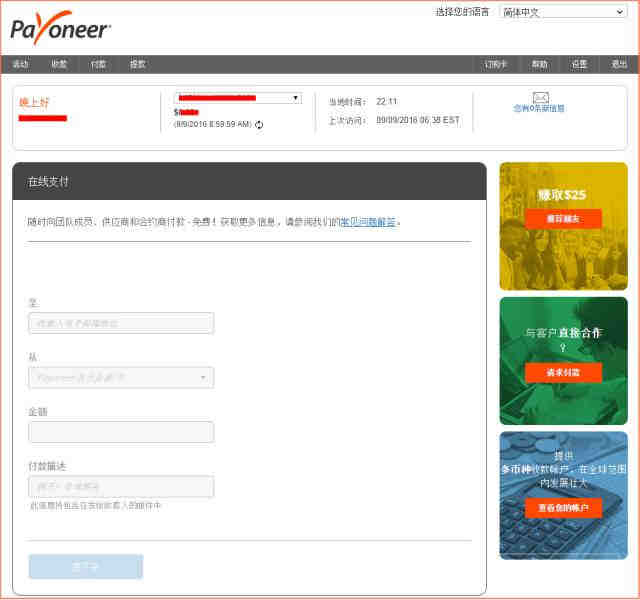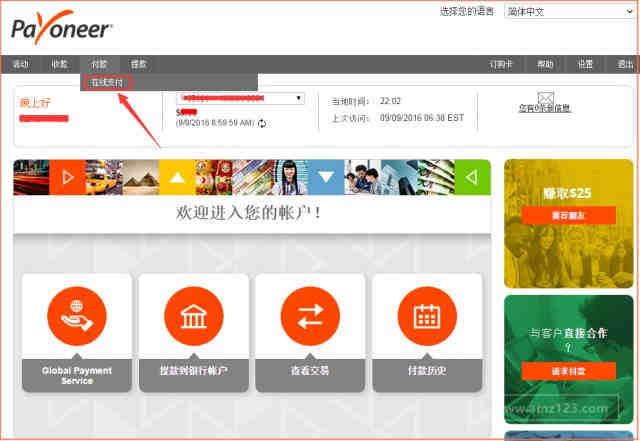 许多Payoneer用户拥有多个币种的账户(美元、欧元、英镑、日元、澳元和加元)。您的账户可能目前只有某个或者某些币种开通了在线支付的功能。您可以登录您的Payoneer网上账户,在登录页面的正上方的下拉菜单中选择对应的币种账户,来查看您是否对应币种账户已经开通了在线支付功能。如果您看到了付款这个菜单,您的账户就可以进行在线支付了。