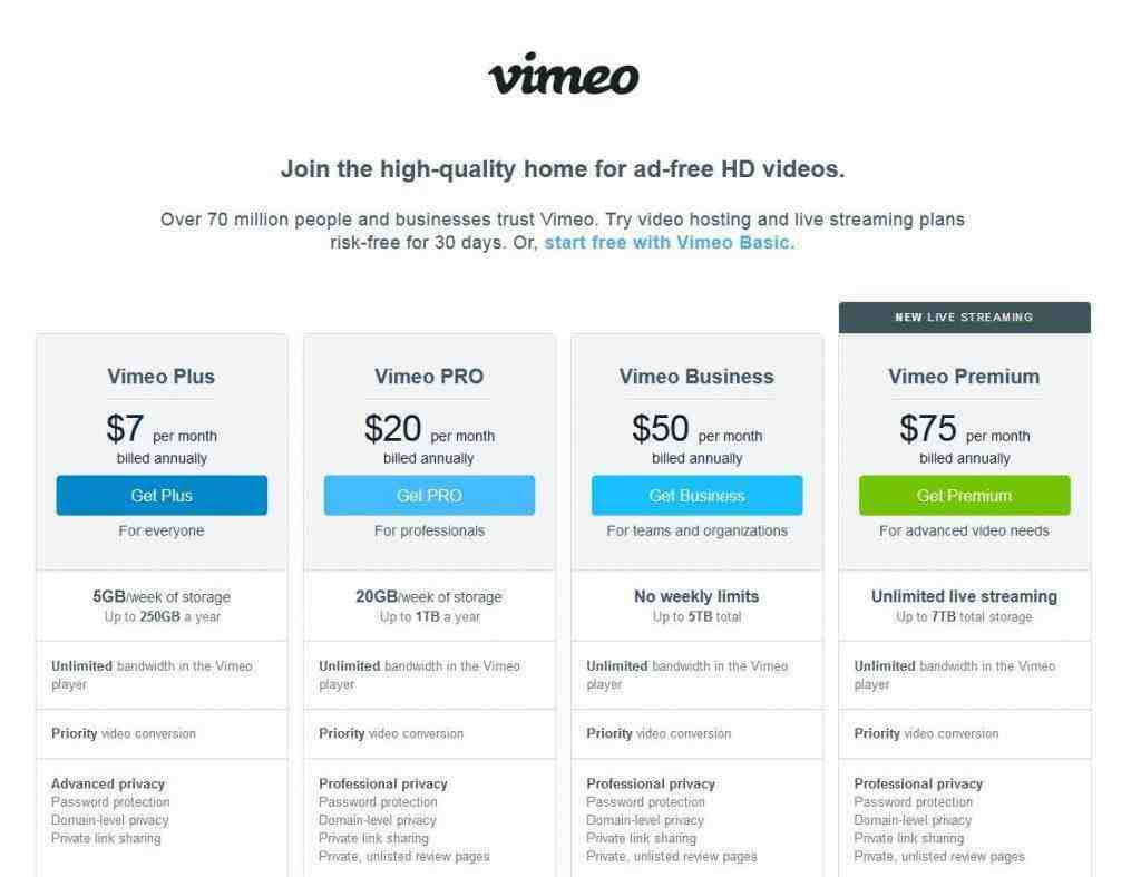 如果达到存储限制,则可以升级计划。除了高级定制和强大的营销和分析工具之外,这些计划的成员还获得了比Vimeo Basic成员更多的存储空间。