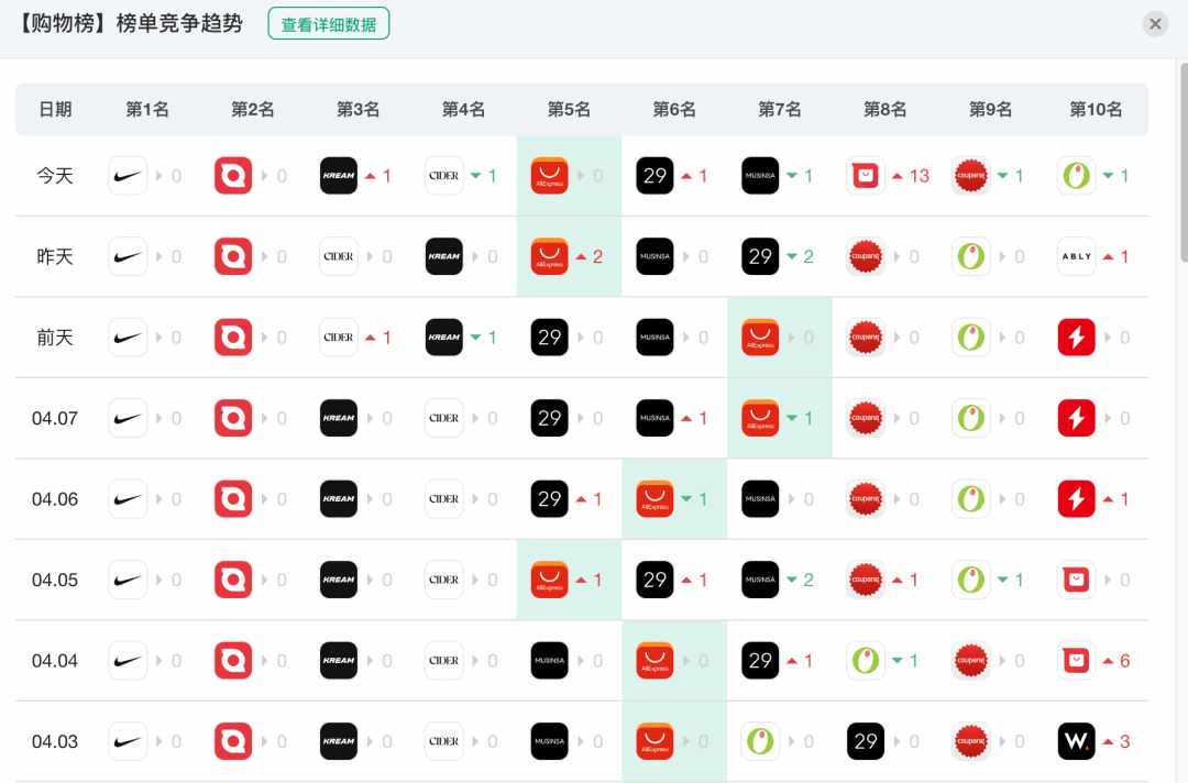 3、流量方面,目前速卖通全托管店铺的权重更高,排名会比较靠前,相信了解速卖通的卖家会发现,很多关键词下,排名靠前的都是全托管店铺,其实这也是一种趋势,既然平台在全力推这种模式,说明平台更愿意给这种商家流量。另外一个方面就是,速卖通在韩国的投入持续增长,包括基础物流以及营销投放层面,尤其是在用户覆盖这个方面,速卖通应用近几个月都是购物榜的TOP10,如下图所示,速卖通排名位置始终处于5-7名。