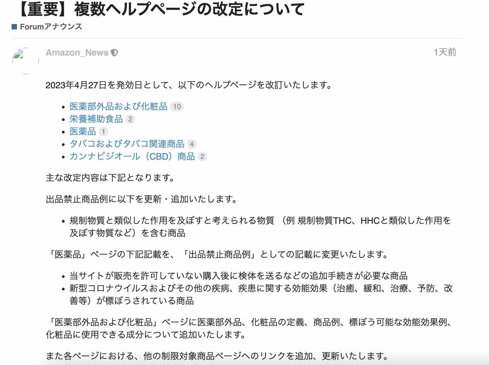 卖方通获悉,亚马逊日本站发布公告称2023年4月27日起将修改准药品和化妆品、膳食补充剂 、药品、烟草和烟草相关产品和大麻二酚(CBD)产品等产品的帮助页面,并且将将更新并添加违禁物品示例,以下是公告内容: