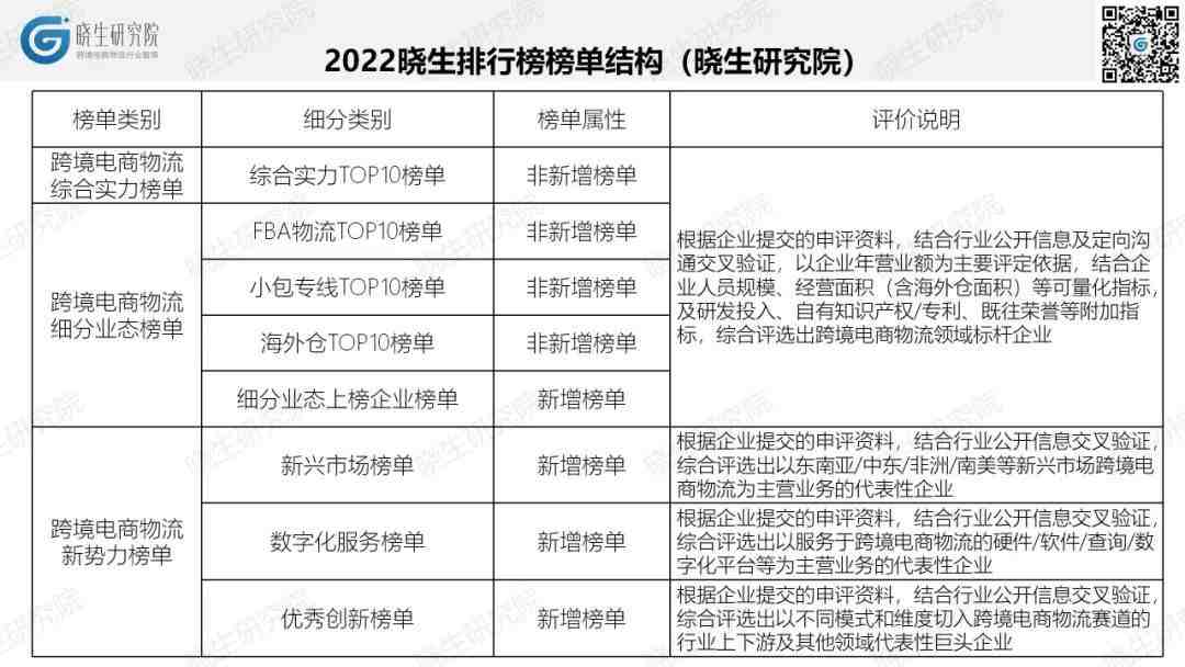 2022晓生排行榜,在原有“跨境电商物流综合实力榜单”、“跨境电商物流细分业态榜单”的基础上,新增了包含新兴市场、数字化服务、优秀创新3个维度在内的“跨境电商物流新势力榜单”,并在“跨境电商物流细分业态榜单”中新增了“细分业态上榜企业”细分类别。