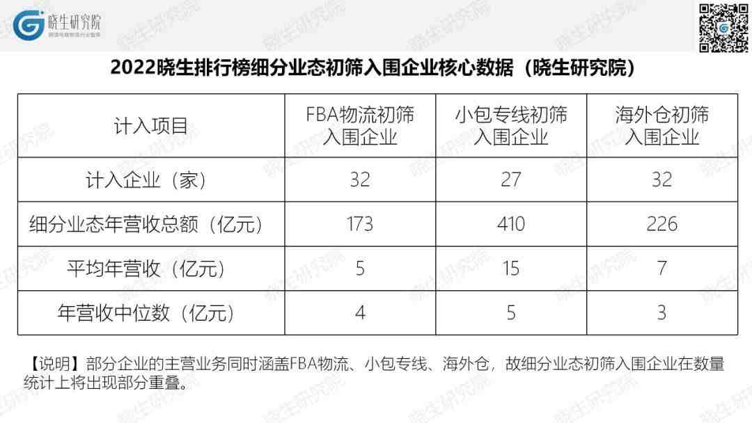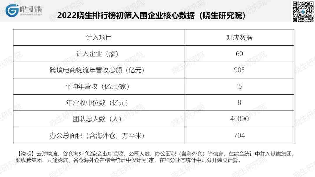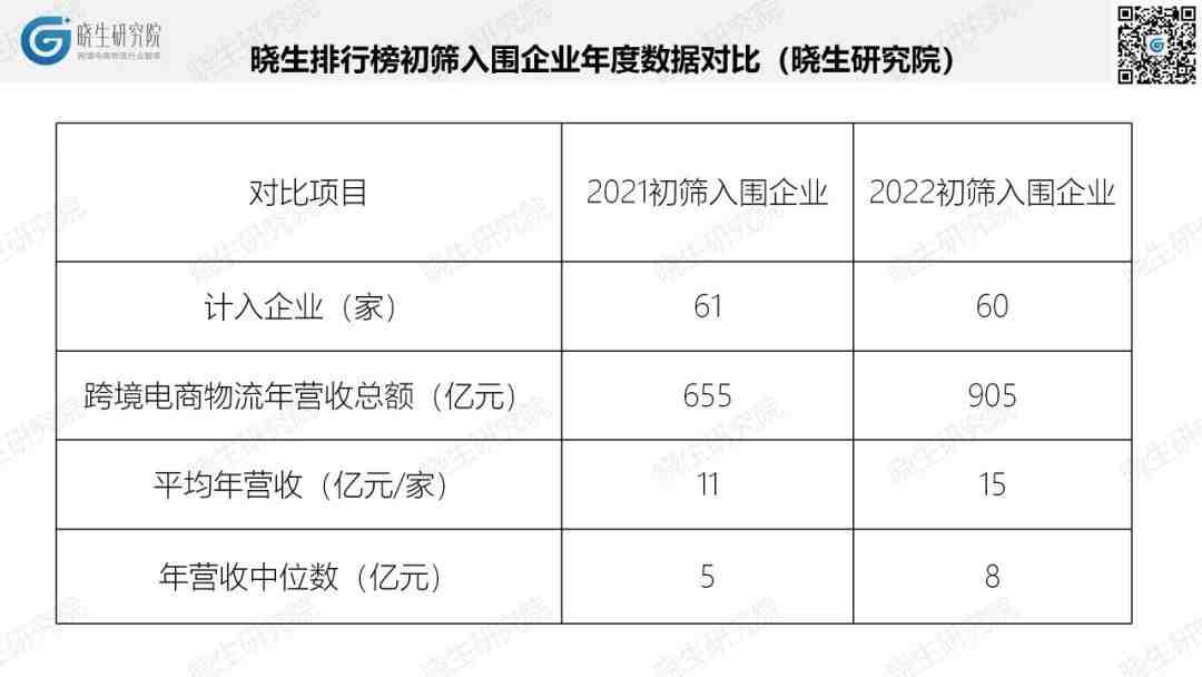 2022晓生排行榜初筛入围企业60家,跨境电商物流业务年营收总和(2021年,下同)超900亿元,单一企业平均年营收超15亿元,年营收中位数约为8亿元。