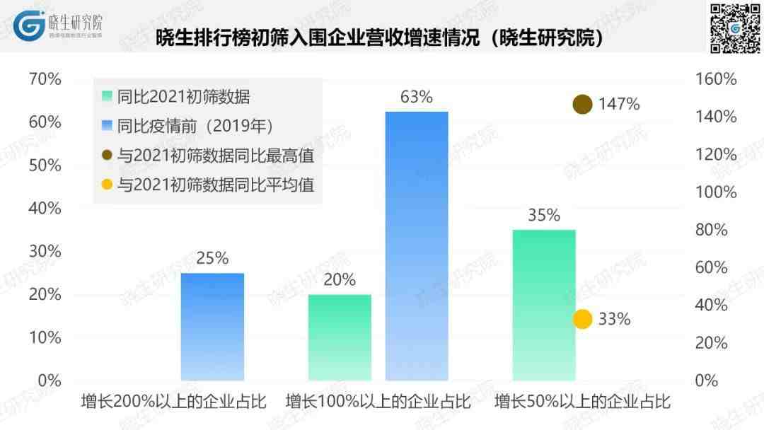 与2021初筛入围企业同比,综合业务最高的企业增速为147%,平均同比增速为33%;增长100%以上的企业占比20%,增长50%以上的企业占比为35%。与疫情前的2019年相比,63%的企业年营收增长在100%以上,25%的企业年营收增长在200%以上。