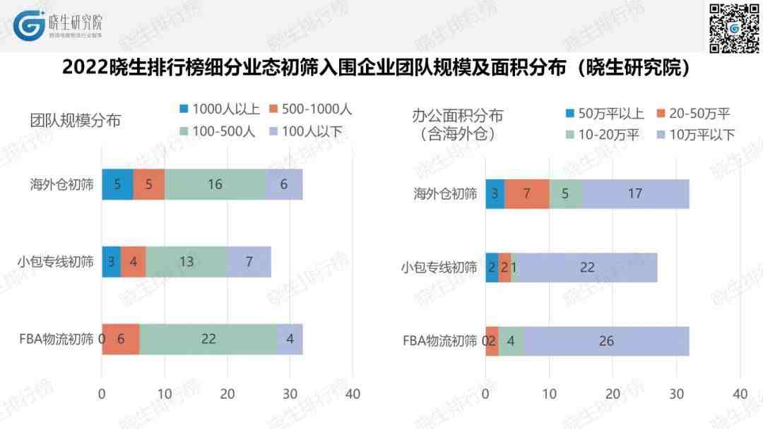 以下将针对“跨境电商物流综合实力榜单”及“跨境电商物流细分业态榜单”初筛入围情况,从综合业务规模、细分业态规模、团队及面积规模3个维度进行分析解读: