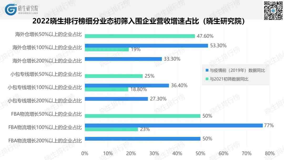 与2021年细分业态初筛数据相比,此次年营收增长在50%和100%以上的企业,FBA物流企业占比均为最高(分别占比50%和23%),其次是海外仓企业(分别占比47.6%和19%)。与疫情前的2019年相比,年营收增长在100%和200%以上的企业,FBA物流企业依然占比最高(分别占比77%和50%),其次是海外仓企业(分别占比53.3%和33.3%)。
