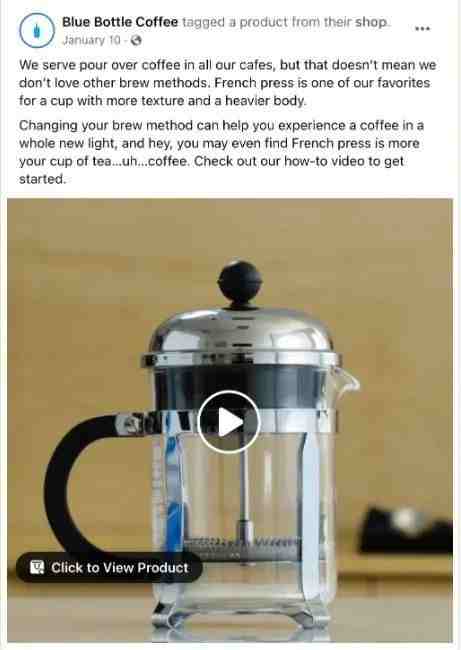 例如,下面的@bluebottlecoffee Facebook 帖子介绍了一种新的咖啡冲泡设备,将其与客户在访问公司咖啡馆时已经知道的流程进行比较。该帖子通过列出最终结果的优点来提高知名度 - 一杯用法国媒体冲泡的咖啡 - 并包括一个视频来引导人们完成酿造过程。