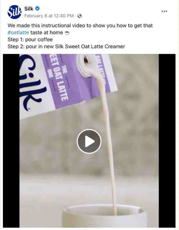 例如,下面的@SilkUS Facebook 帖子分享了客户可以用来冲泡燕麦拿铁的两个简单步骤。该帖子包含一个 8 秒的视频,展示了使用该品牌的燕麦产品是多么容易,并鼓励客户尝试它们。
