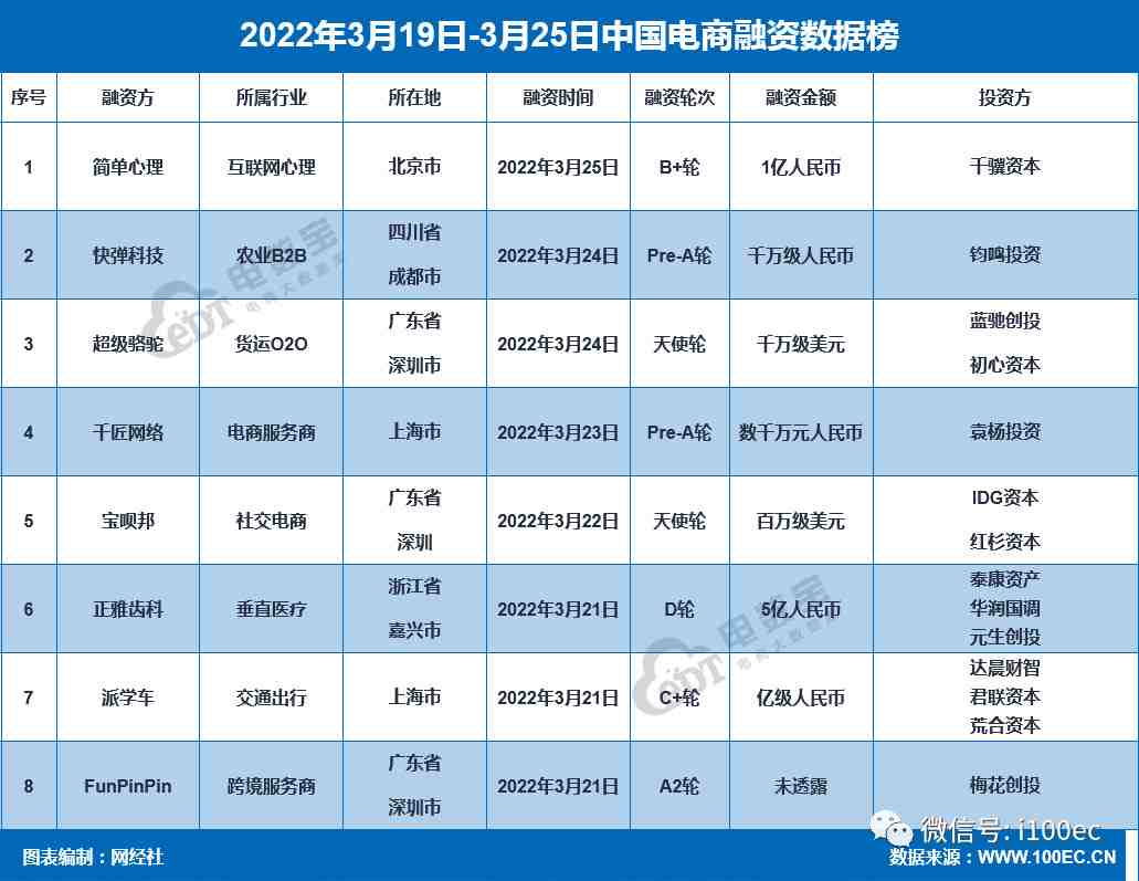据网经社“电数宝”电商大数据库(DATA.100EC.CN)监测显示,截至目前,3月第四周各电商领域的投融资事件共8起,总融资超8.05亿元。