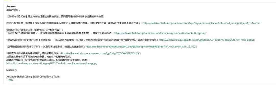 年前,亚马逊已出公告提示德国和法国卖家尽快确认EPR合规。由于没有采取强制举措,很多卖家并没有着手准备。