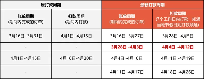 新规则首次执行时间段:账单周期为3月28日-4月3日,打款周期为4月4日-4月12日。