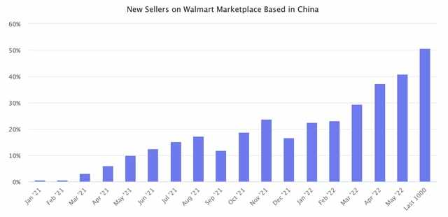在沃尔玛平台中,中国卖家的比例也在稳步上升,截止2022年Q3季度,沃尔玛平台新卖家中,中国卖家比例已经超过了50%。