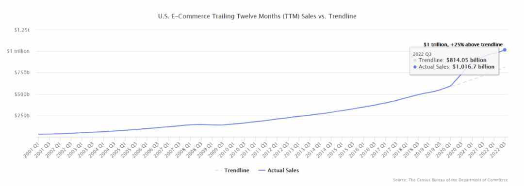 从整体消费趋势来看,美国电子商务端销售额自2001年以来一直保持平稳增长趋势。但在2020年后,其增幅明显超过历年均值。