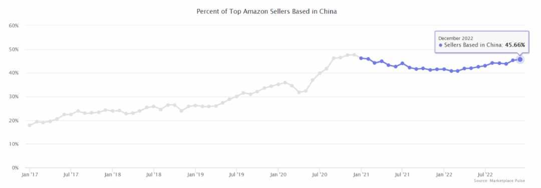 在2020年初,由于亚马逊市场调整,中国卖家在顶端争夺中失去了原有的优势,在2月底,亚马逊TOP卖家中,中国卖家的市场份额由巅峰时的47%下降到了40%。但在2022年底,中国卖家重新夺回了之前失去的份额,在TOP卖家中的比例重新上升至45%。