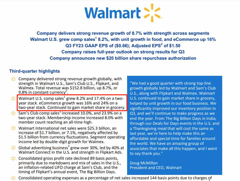 同亚马逊停滞不前相比,沃尔玛的上升势头迅猛。在亚马逊2022年Q3季度净利润下降时,沃尔玛同比上年,利润增长率达到16%。