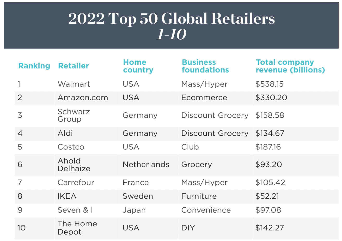前十名中的其他排名变化包括:第13名阿里巴巴(从2021年的第五名下降),第六名Ahold Delhaize(从第七名上升),第七名家乐福(从第八名上升),第八名宜家(从第九名上升),第九名Seven&I(从13名上升),以及第十名家得宝(从第15名上升)。