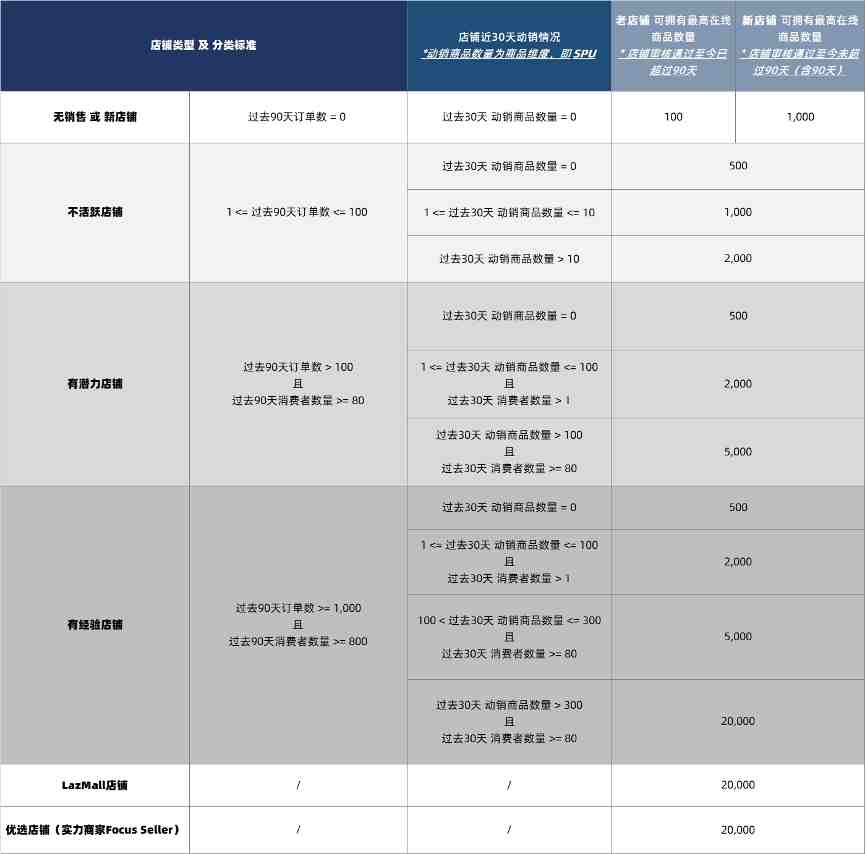 从2022年3月31日起,平台将会根据店铺历史销售情况以及店铺类别评定对应的最高在线商品数量。 最高在线商品数量指的是一个店铺内最多可拥有的在线商品数量(商品维度SPU,非SKU)。具体规则详见下表: