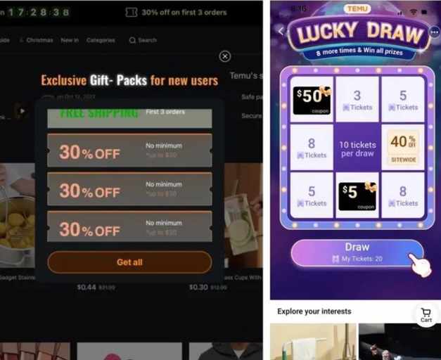 (1)下载Temu并注册Temu,新用户会有多种模式的抽奖和优惠券领取,大大提高了客户的留存率: