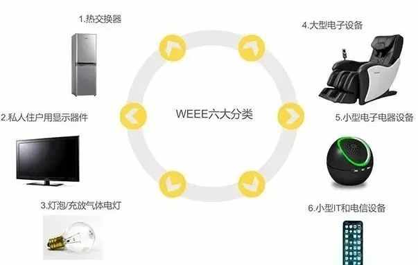 最新的德国WEEE法规把电子电气设备分为热交换器、私人住户用显示器件(屏幕)、灯/充放气体电灯、大型电子设备 (大家电)、小型电子设备 (小家电)、小型IT和电信设备六大类。