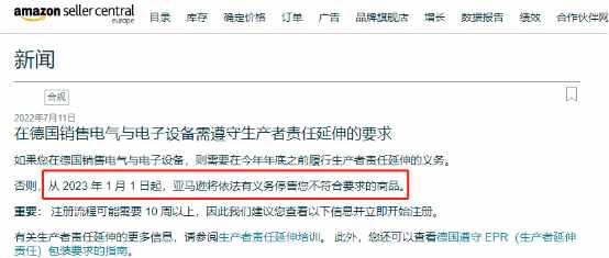 上传入口的开放,也意味着WEEE强制执行进入倒计时。亚马逊曾发布公告提醒,WEEE将于2023年1月1日起强制执行,届时亚马逊将有义务暂停在WEEE商品分类下发布的不合规商品。
