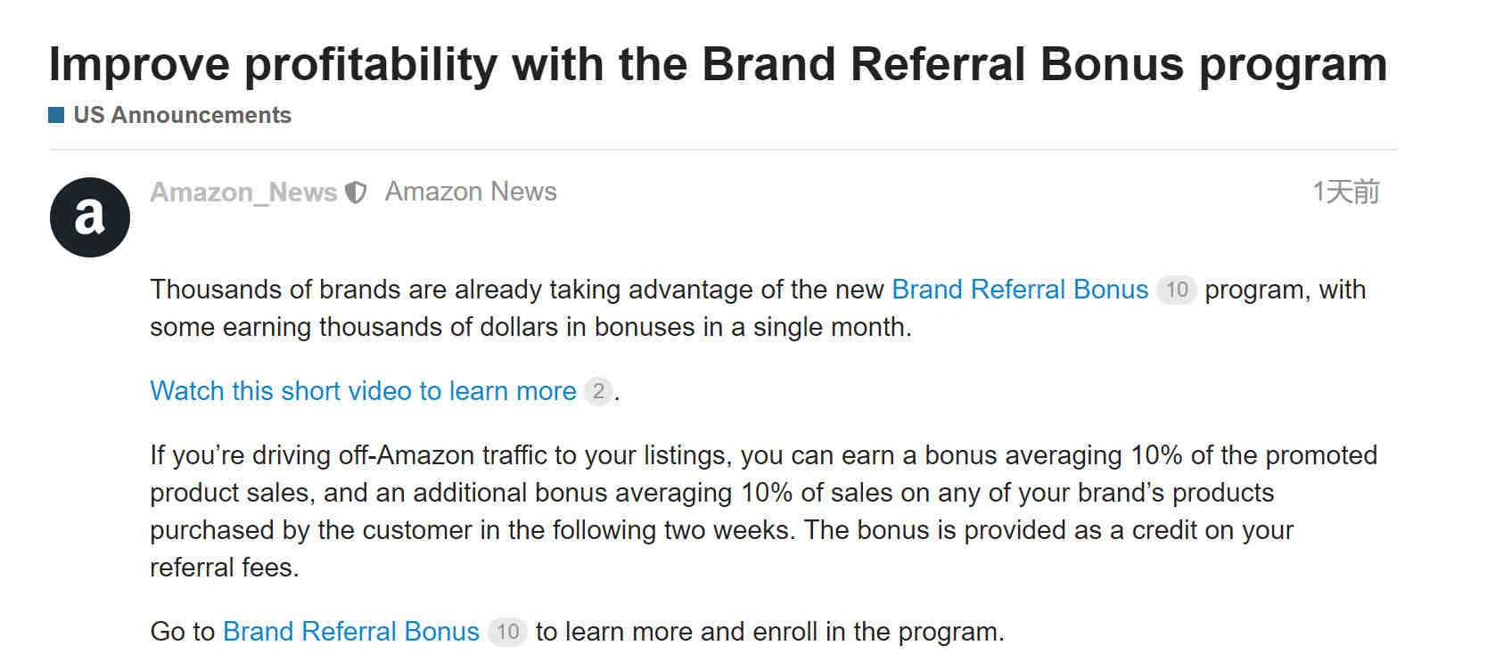 卖方通获悉,亚马逊美国站发布公告为品牌卖家介绍新的“品牌推荐奖金计划”,该新计划在助力卖家销售的同时还能为卖家提供额外奖金激励,以下是公告内容: