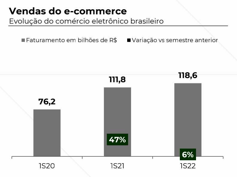 调查显示,巴西今年上半年在线销售总额为 1186 亿雷亚尔,较去年同期增长 6%。不过,与 2020 年同期相比,去年上半年增长了 47%。