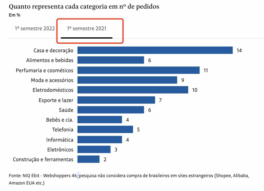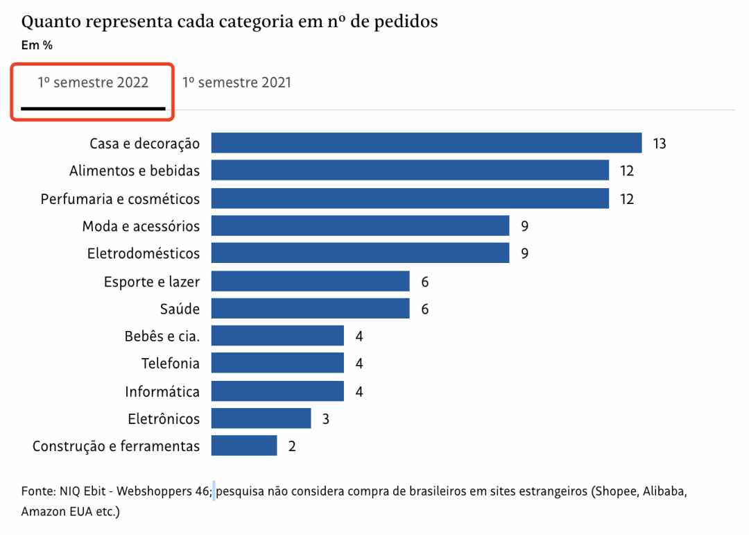 尽管在调查中没有计算外国网站的总销售额,但 NielsenIQ|Ebit指出,2022 年上半年,有 54% 的巴西人在跨境网站上进行了购买。与去年同期相比,这一总数有所下降。2021 年,68% 的人在这些门户网站上购物。