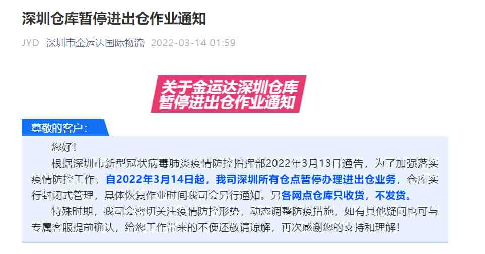 1.通知:为配合全深圳市疫情防控工作,明日3-15开始监管中心陆运、海运业务暂停,具体恢复时间待定,感谢各位客户的理解与支持.