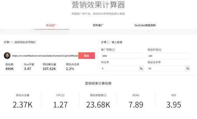 Nox聚星营销效果计算器能够根据推广的产品,为品牌方提供营销效果数据,帮助品牌方提前对营销活动有更好的把控。
