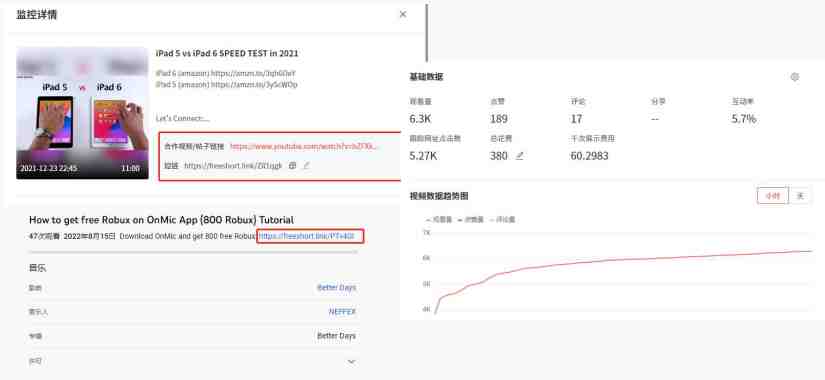 Nox聚星推广效果检测功能,不仅能实时监测到合作视频的基础数据,还能以图标等形式直观体现出合作视频的各项表现,为品牌提供全面的网红营销效果报告。