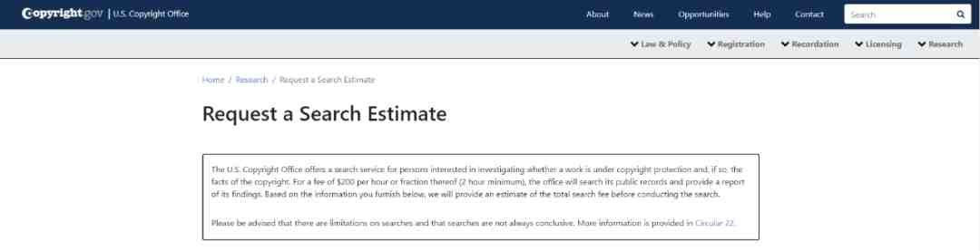 4、美国版权局可以提供付费查询服务,具体收费按查询的时间计算。收费标准为200美元/小时,2小时起步;